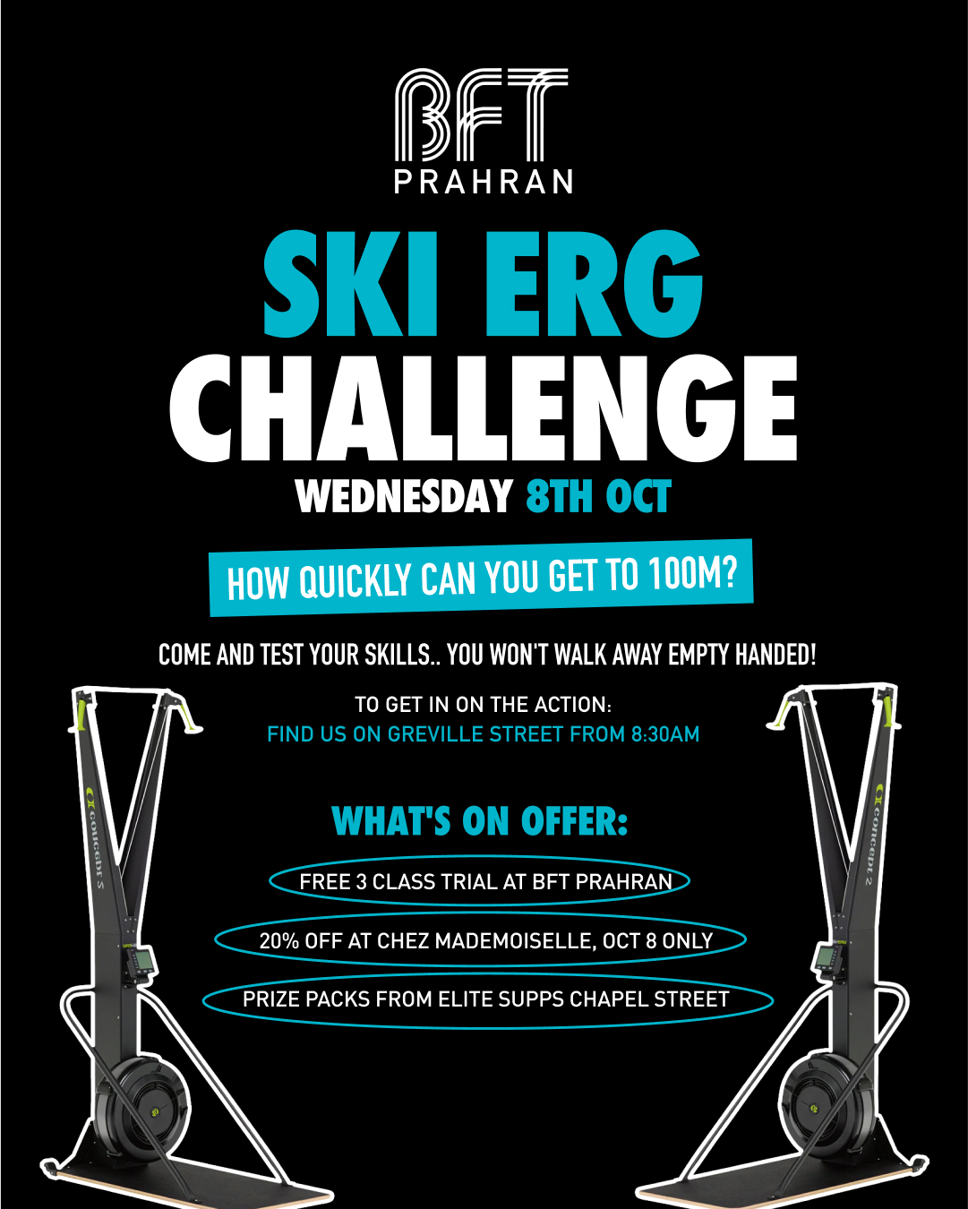 Think you’ve got what it takes to conquer the Ski Erg? Head down to the corner of Greville and Grattan Streets and put your power to the test at BFT Prahran’s Ski Erg Challenge — open to everyone and free to enter!